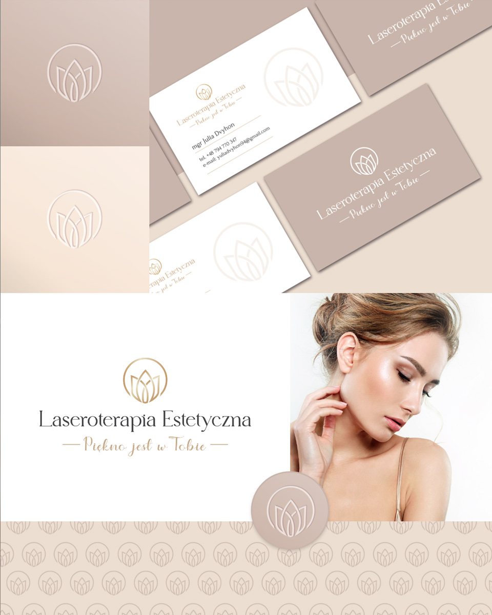 Logo zaprojektowałam tak, aby łączyło subtelną elegancję z profesjonalizmem, symbolizując precyzję zabiegów medycyny estetycznej. Kolorystyka jasne beże, biel i złoto nadaje projektom graficznym premium charakter.